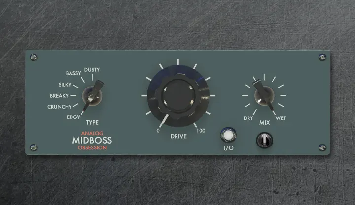 MidBoss’s design prioritizes efficiency with direct controls, facilitating its quick use during the mixing phase. In addition to the Type, DRIVE, and MIX selectors, the plugin includes an OUT control for Clean Gain (+/- 15dB) to ensure a healthy output level, and an I/O Bypass button for quick A/B comparison of the processing.