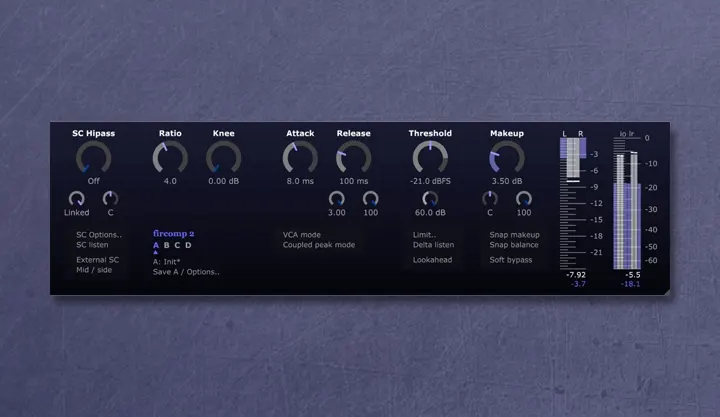 A pesar de tener una interfaz que parece sencilla a primera vista, FirComp2 esconde una profundidad técnica impresionante. El plugin permite ajustar el codo de la compresión (Knee) de forma muy precisa y ofrece una función de Lookahead (anticipación) que, combinada con su capacidad de True Peak, lo transforma prácticamente en un limitador de picos de alta gama. Además, incluye un filtro de cadena lateral (Sidechain) ajustable, lo que permite que las frecuencias graves no disparen la compresión de forma innecesaria, manteniendo el impacto de los bombos o el cuerpo de los bajos.