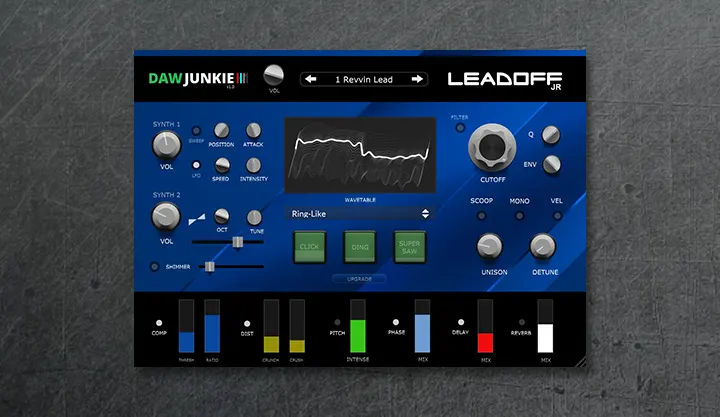 In a world full of synthesizers with thousands of parameters and hidden menus, LeadOff Jr by DAWJunkie arrives like a breath of fresh air. Recently released, this virtual instrument presents itself as the compact yet ferocious version of its bigger brother, designed specifically for one task: creating lead sounds that cut through the mix with clarity and attitude. It’s the ideal tool for those who value immediacy and sound quality over excessive complexity.