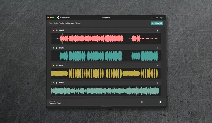 Go-Splitter is a free desktop application for macOS and Windows that splits a complete mix into four independent tracks: Vocals, Drums, Bass, and Other. Because it runs locally, it ensures complete privacy and allows you to work offline.